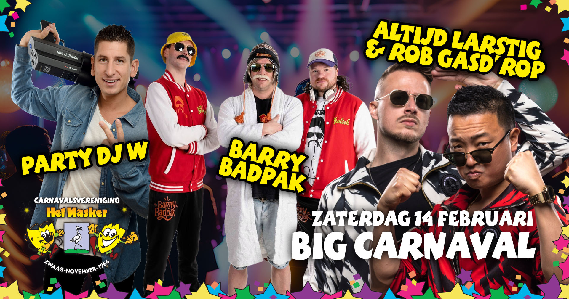 Tijdens Big Carnaval is iedereen (18+) van harte welkom in de Leuttempel. Ieder jaar weer een afgeladen zaal vol met feestvierders en iedereen is uitgedorst in uiteenlopende creaties. Dit jaar hebben we weer een fantastische artiesten weten te strikken om deze avond legendarisch te maken. Wat dacht je van Barry Badpak, Party DJ W én Larstig & Gasdrop! Dat wordt een avondje knallen zeg!