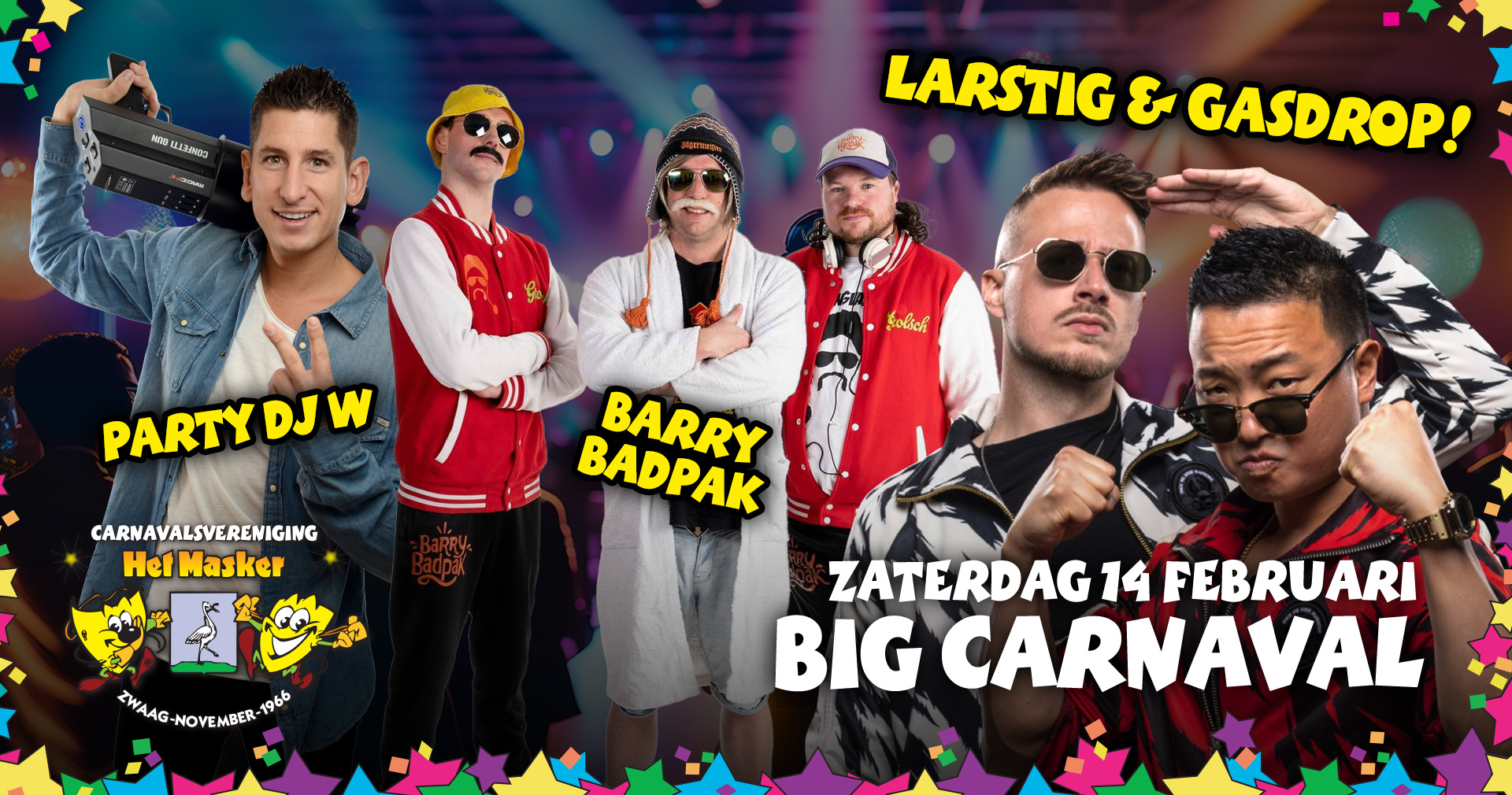 Tijdens Big Carnaval is iedereen (18+) van harte welkom in de Leuttempel. Ieder jaar weer een afgeladen zaal vol met feestvierders en iedereen is uitgedorst in uiteenlopende creaties. Dit jaar hebben we weer een fantastische artiesten weten te strikken om deze avond legendarisch te maken. Wat dacht je van Barry Badpak, Party DJ W én Larstig & Gasdrop! Dat wordt een avondje knallen zeg!