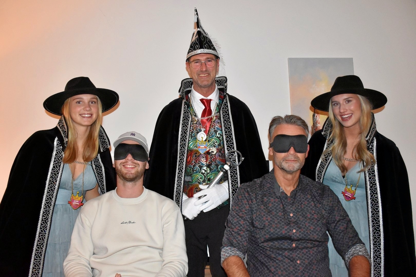 Eenmaal op de plek van onheils aangekomen werden Dylan en Piet subtiel naar binnengeloodst en eenieder op een stoel gezet. Nog met de oogmaskers voor mochten ze aan de gezichten van de nieuwe Prins en uiteraard ook de Hofdames gaan voelen. Na een uitgebreide inspectie was er nog geen enkele herkenning. Dan maar over op vragen stellen waarop het Decorum alleen maar ja en nee antwoorden mocht geven met een vervormd stemmetje. Ook dat leverde geen enkel idee op van wie het zouden kunnen zijn bij de heren. Tja, dan zat er niets anders op dan de blinddoek maar af te doen.