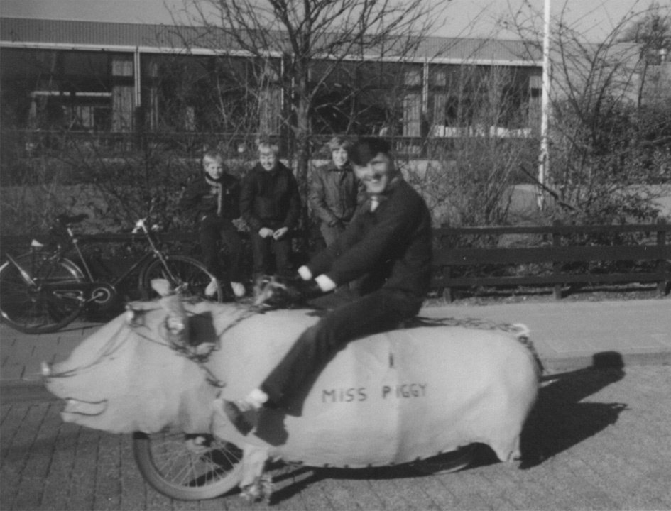 Carnaval draait om humor. Arie had een bromfiets omgebouwd tot feestvarken. Hiermee scheurde Arie door de optocht.