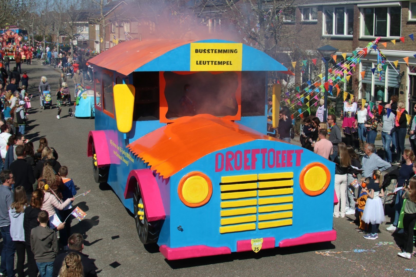 De kleurrijke vette partybus stiefelde mooi over de route door de Zwaagse straten en haalde feilloos de eindBUStemming de Leuttempel waar nog een mooi feestje werd gevierd.