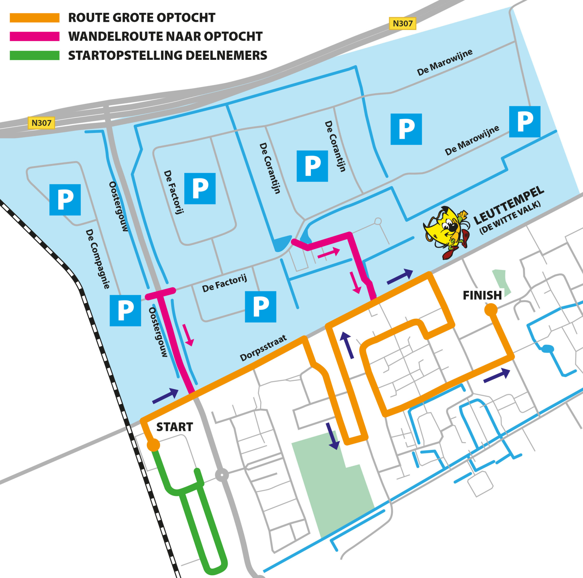 Voor alle bezoekers van de Grote Carnavalsoptocht zijn er heel veel parkeermogelijkheden. In verband met de afsluiting van de Dorpsstraat is het advies om te parkeren op het industrieterrein aansluitend aan de route. Parkeren hier is gratis en je kunt gemakkelijk te voet de route bereiken via twee wegen (Oostergouw en het pad naast De Corantijn 11A). Bekijk de plattegrond op deze pagina om alle parkeermogelijkheden te bekijken. Om te parkeren kun je ook navigeren naar: