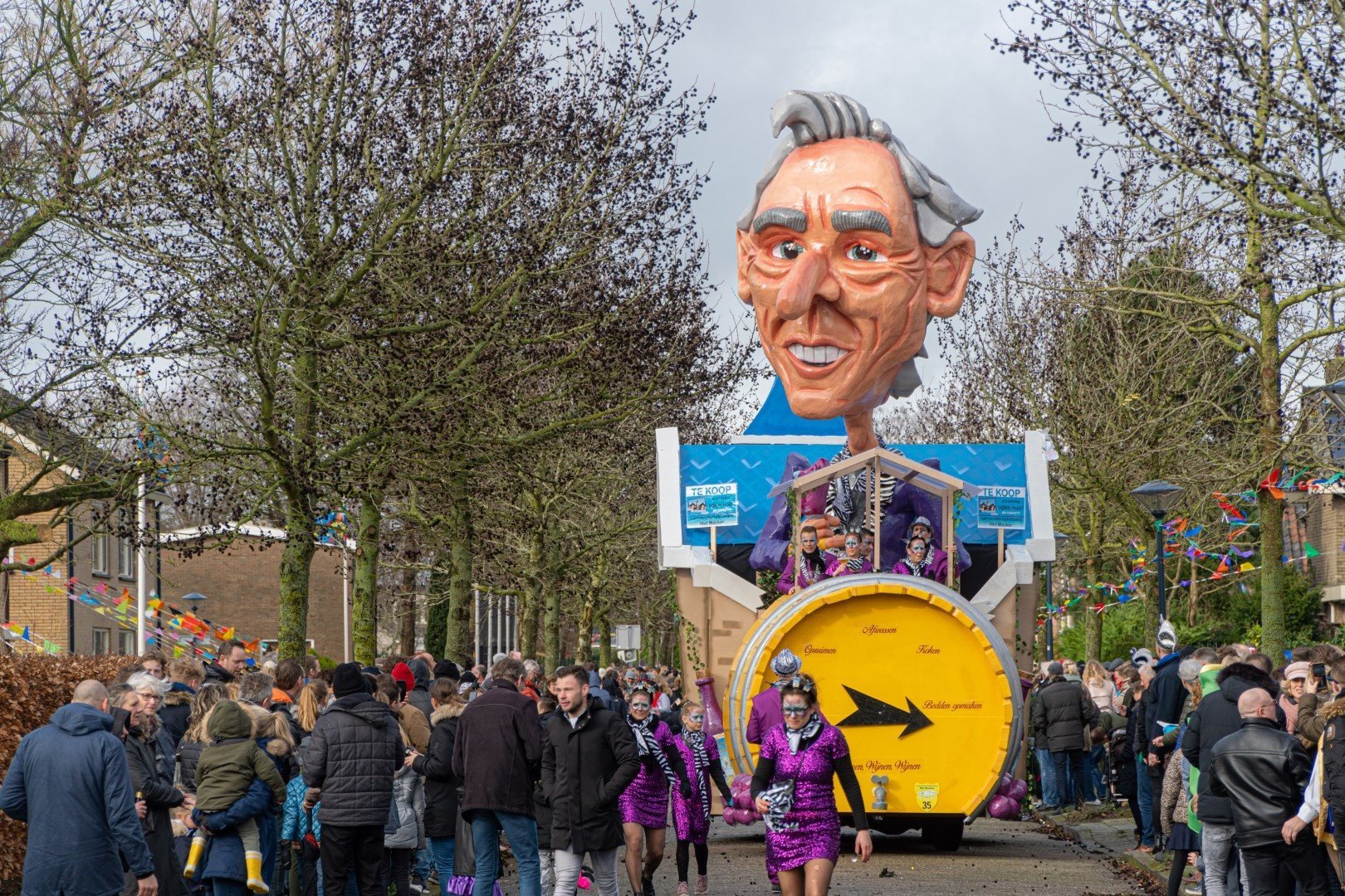 Prominent aanwezig op de wagen was natuurlijk de hoofdpersoon Martien Meiland die op Madame Tussauds achtige wijze was nagemaakt.