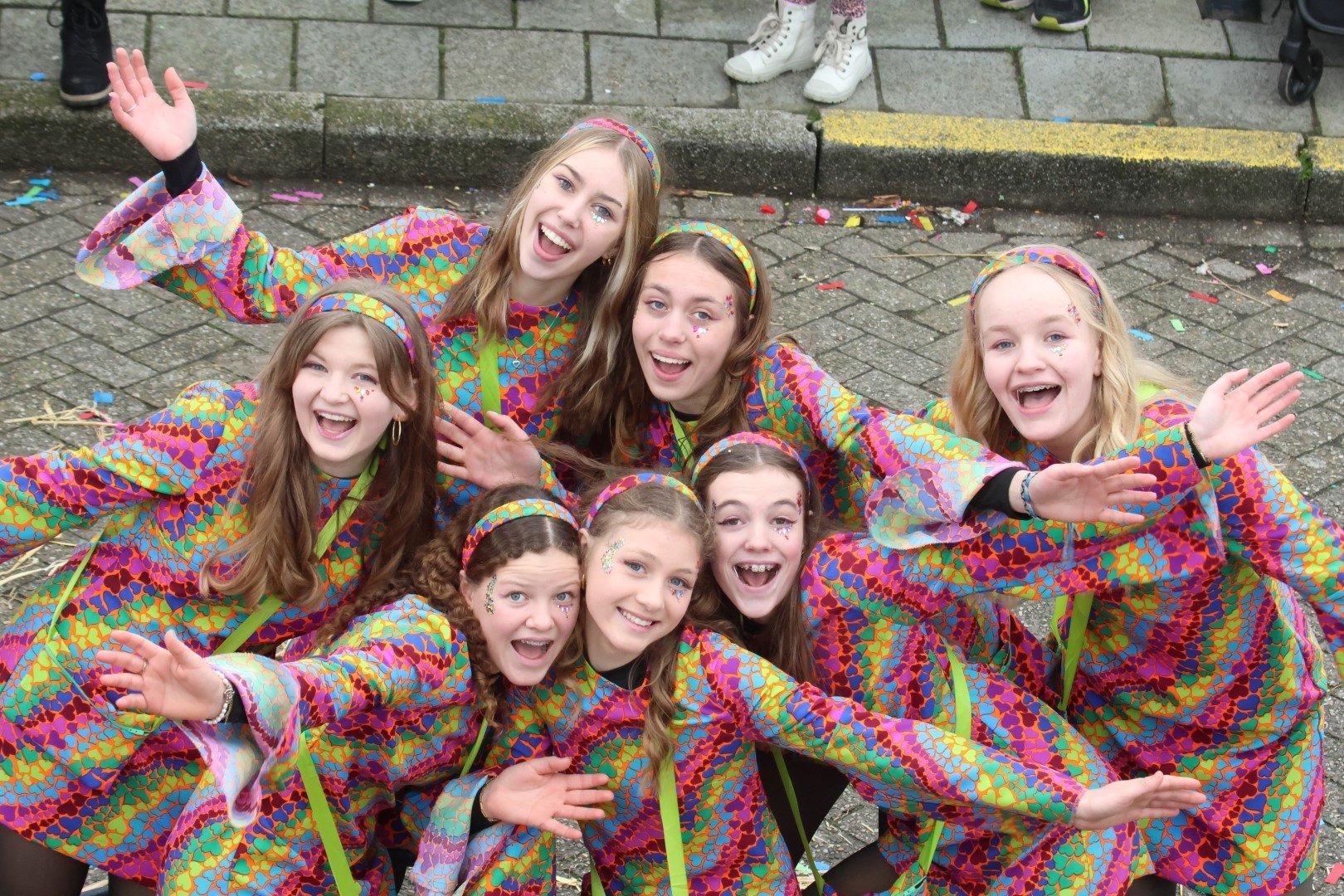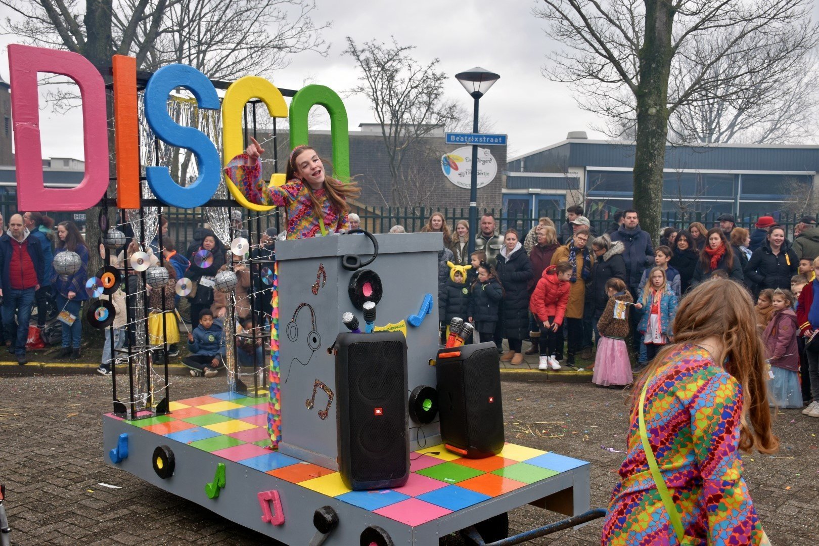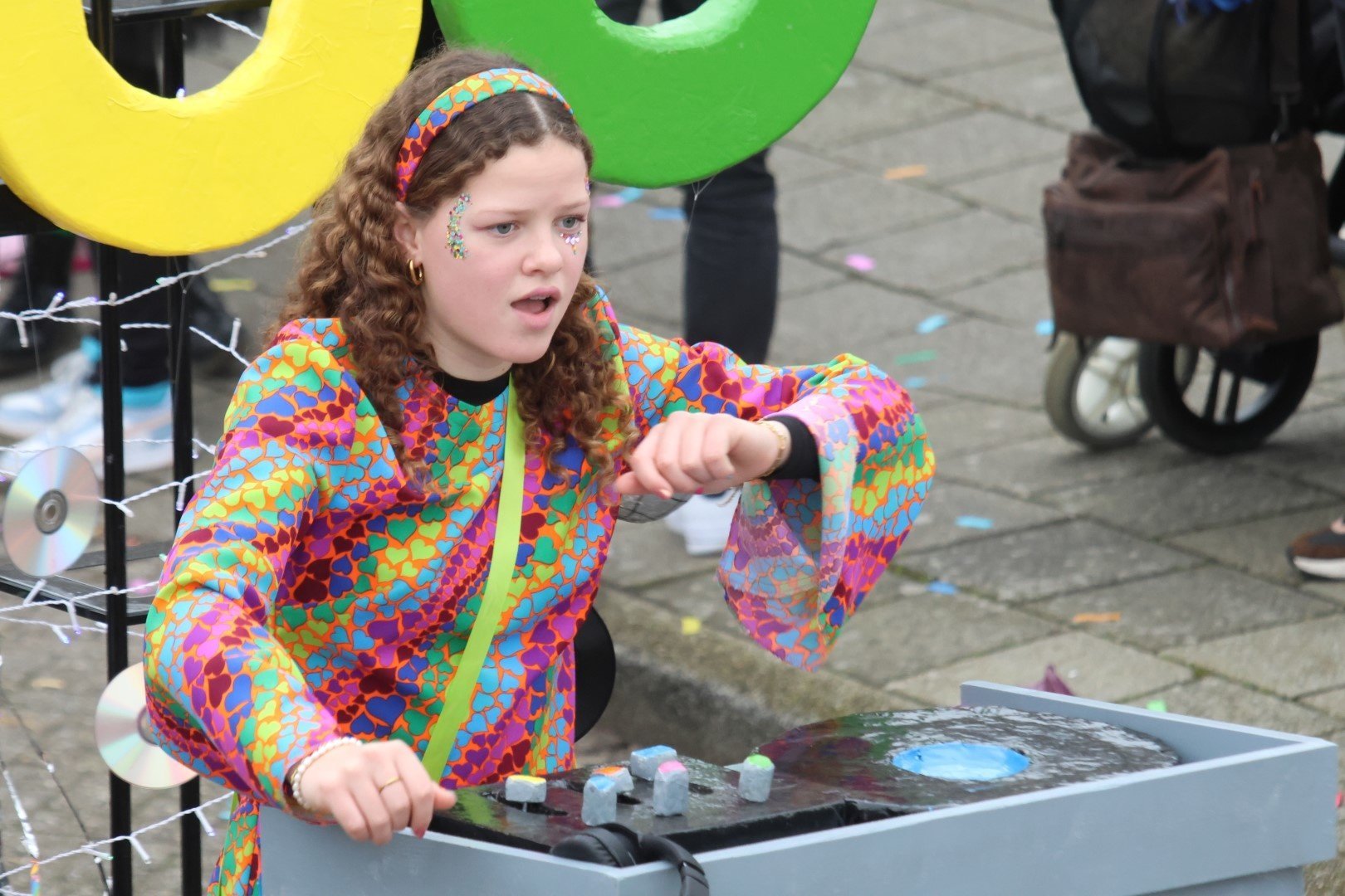 Op de bijpassende muziek, gedraaid vanuit de DJ booth op het wagentje, werd een dansje gedaan. De kleding zag er kleurrijk uit en allemaal dezelfde accessoires, een mooie eenheid.