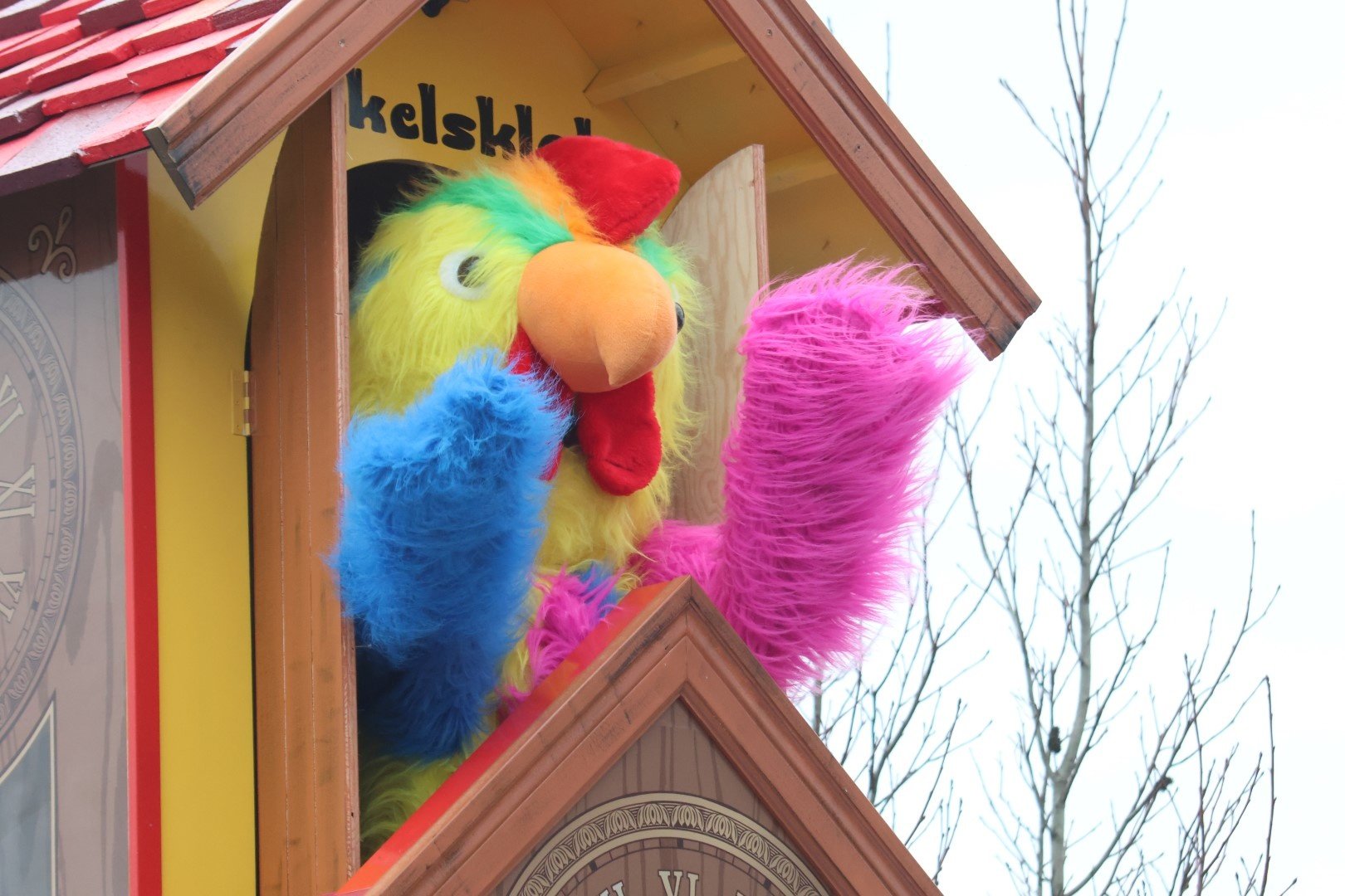 Helemaal bovenop bevond zich de koekoeksklok waar zo nu en dan het vogeltje, nou ja, het was een beste vogel, al zwaaiend naar buiten kwam.