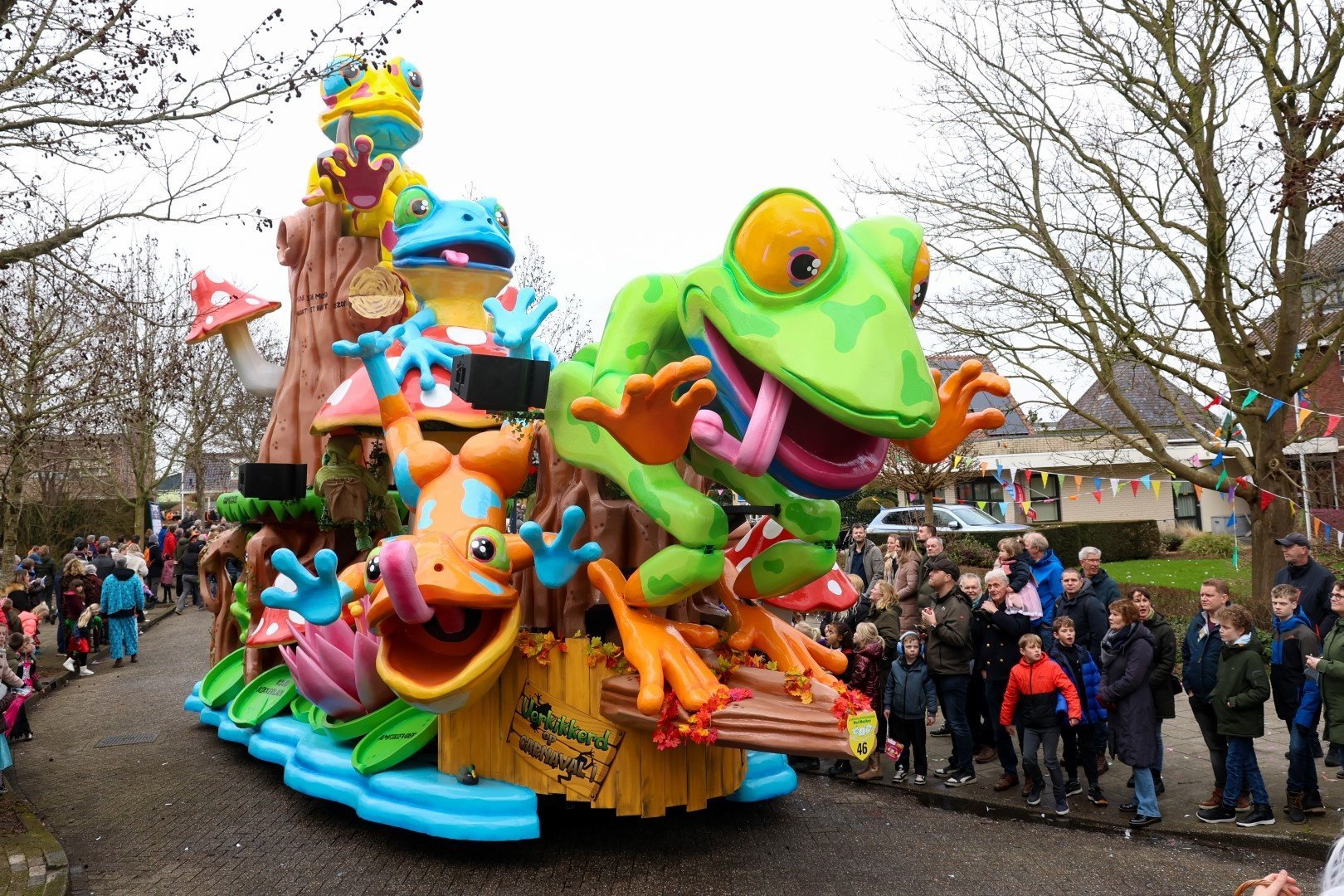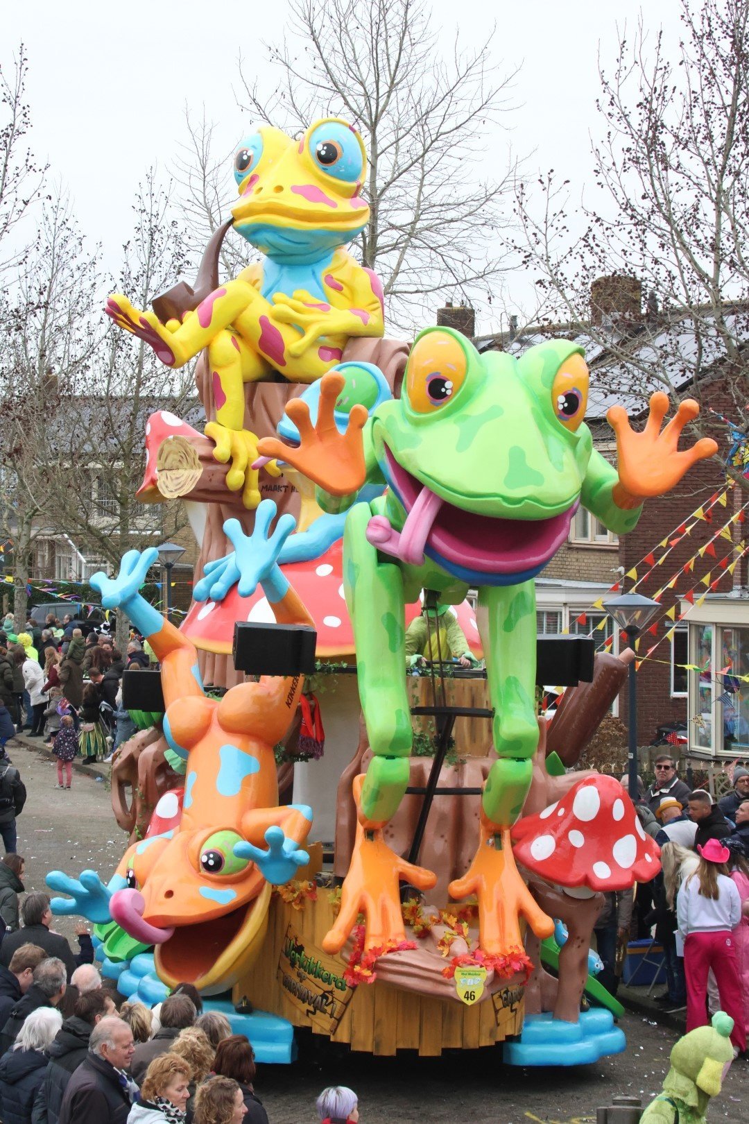Dat De Wicky’s verkikkerd op carnaval zijn wisten we al een tijdje maar nu lieten ze het dan ook letterlijk zien. Een creatie die er echt uit sprong! Ook letterlijk want als de grote groene kikker voorop zich meterslang uitstrekte leek hij bijna van de wagen af te springen. Een mooi staaltje techniek van de mannen. Verder sprekende kleuren en het leek of bijna alles aan de creatie wel bewoog.