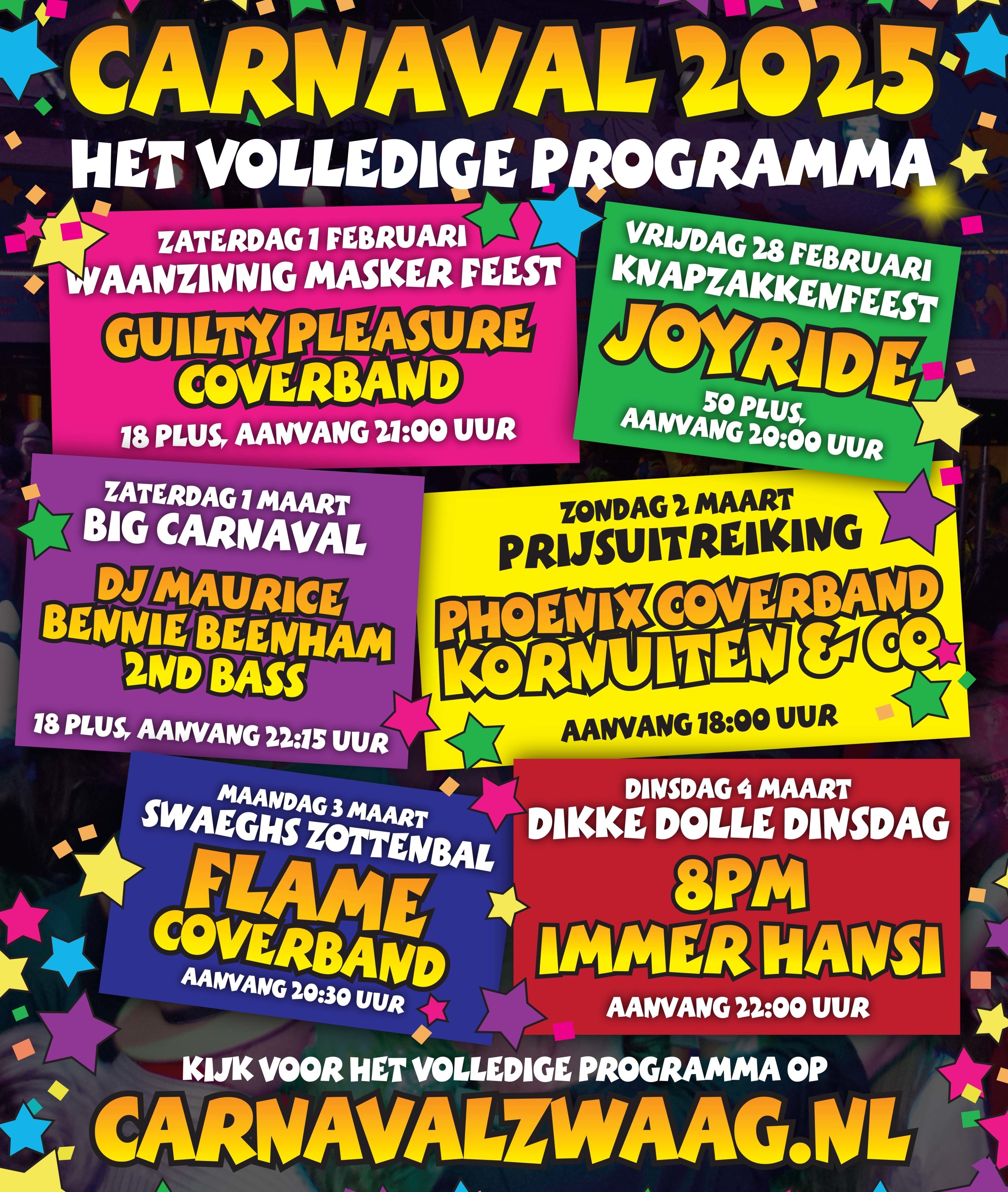 Tijdens de druk bezochte MaskerPubQuiz werd onder luid applaus de volledige line-up voor Carnaval 2025 bekend gemaakt. En daar staan heel veel super toffe namen in. Hieronder het totale overzicht van wat je te wachten staat!