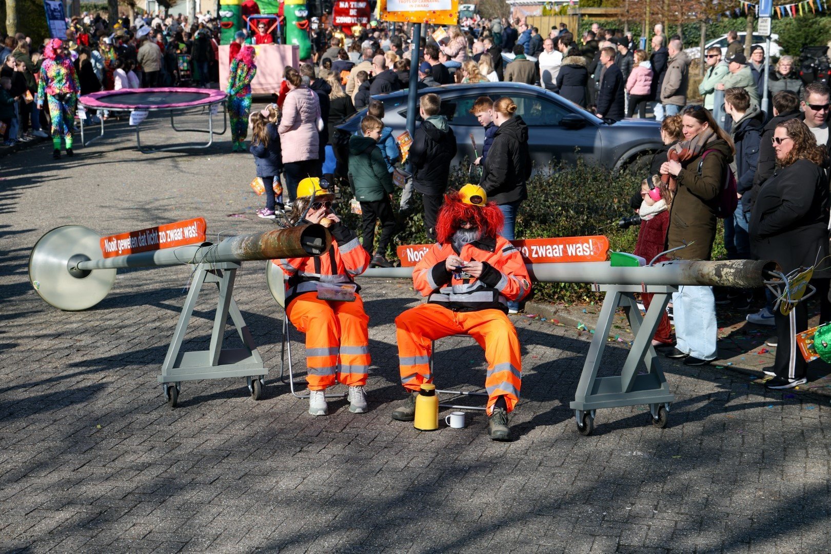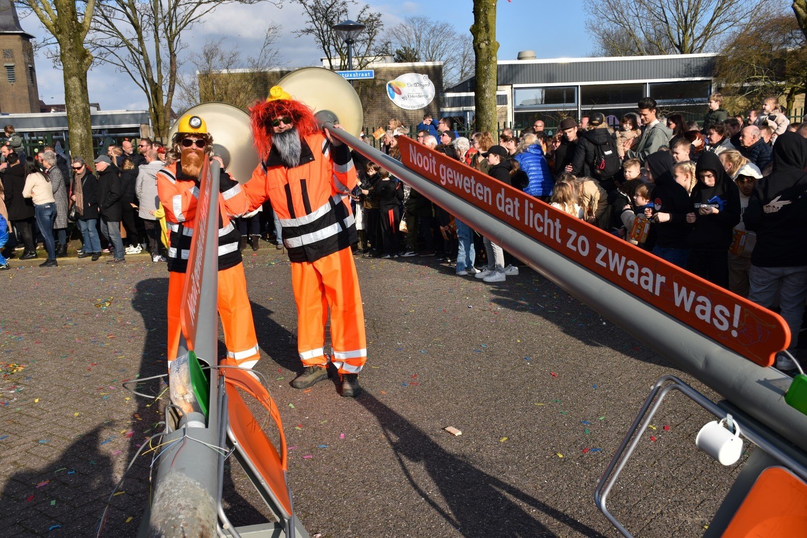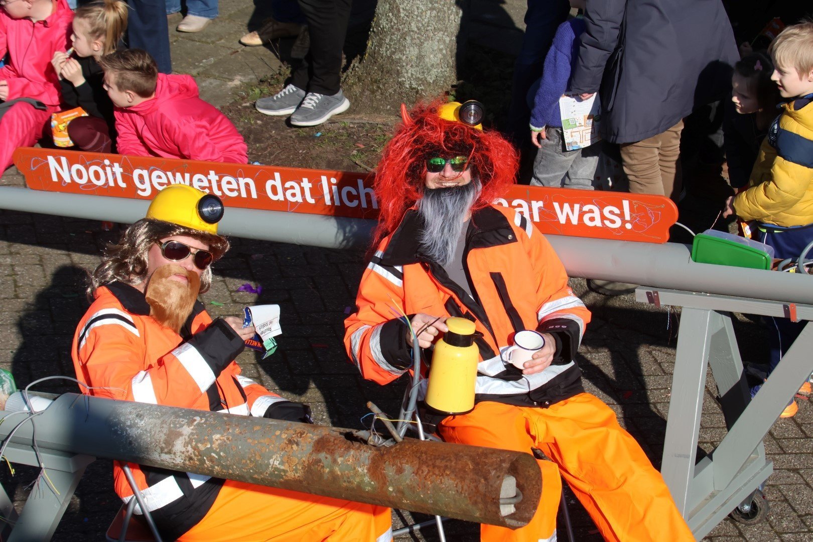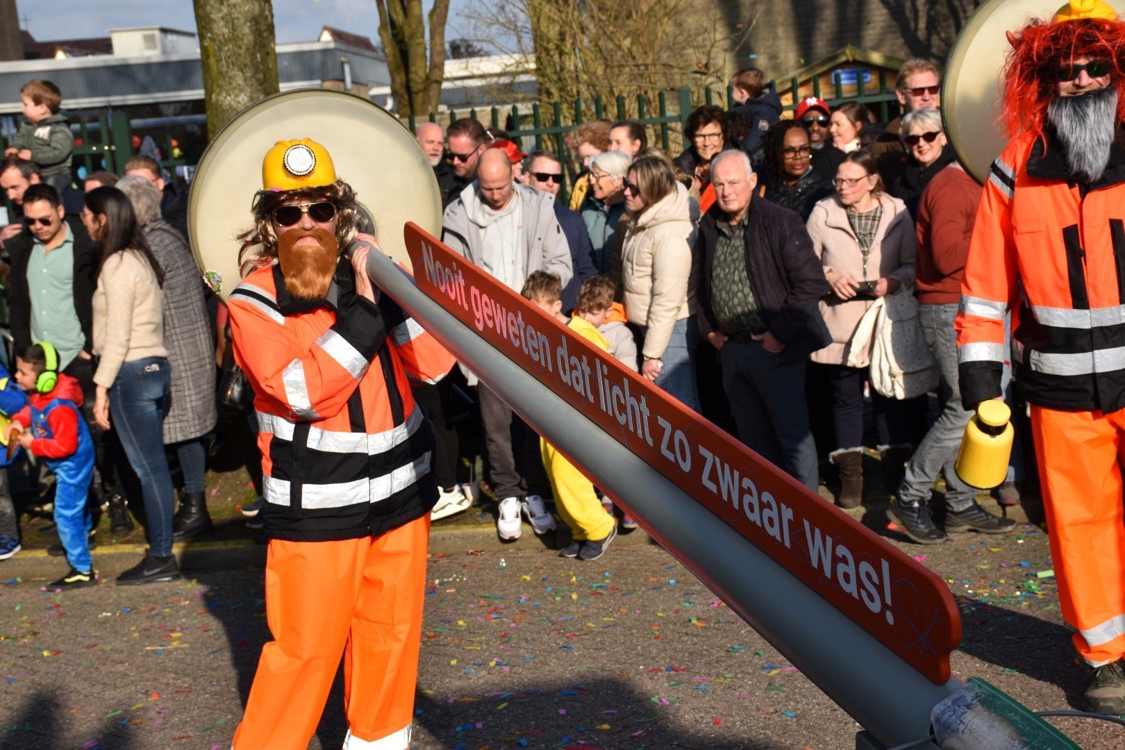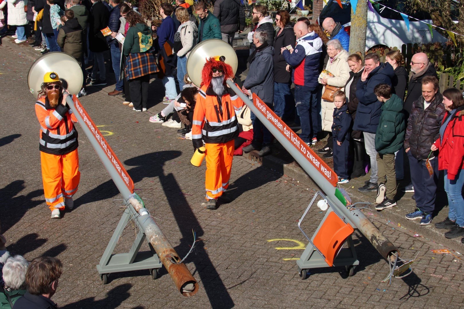 Verkleed, nou ja meer vermomd, als twee bouwvakkers liepen deze twee individuen door de Zwaagse straten met hun lantaarnpalen. Wie het waren? Geen idee maar leuk bedacht was het wel.