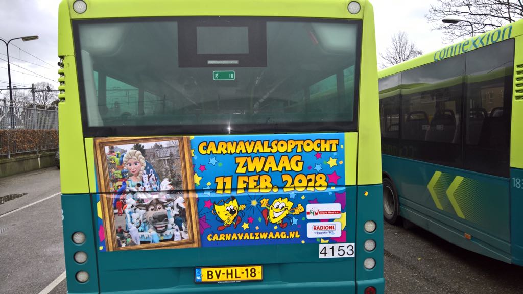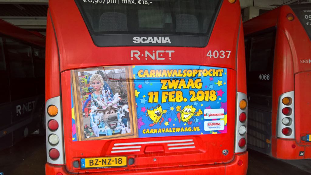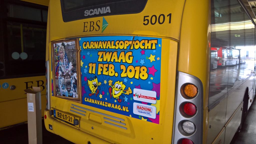 Je kunt niet meer in de auto of op de fiets stappen zonder iets van Het Masker tegen te komen. Want naast onze schitterende poort en aankondigingsborden en -spandoeken rijden er ook weer lijnbussen rond met een mooie sticker achterop. De promotie van ons Carnavalsweekend gaat dus ver voorbij de Zwaagse grens. Met medewerking van OV Media, HydroWest en RadioNL staan de stickers er weer mooi op!