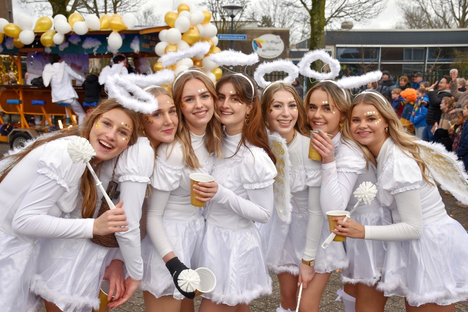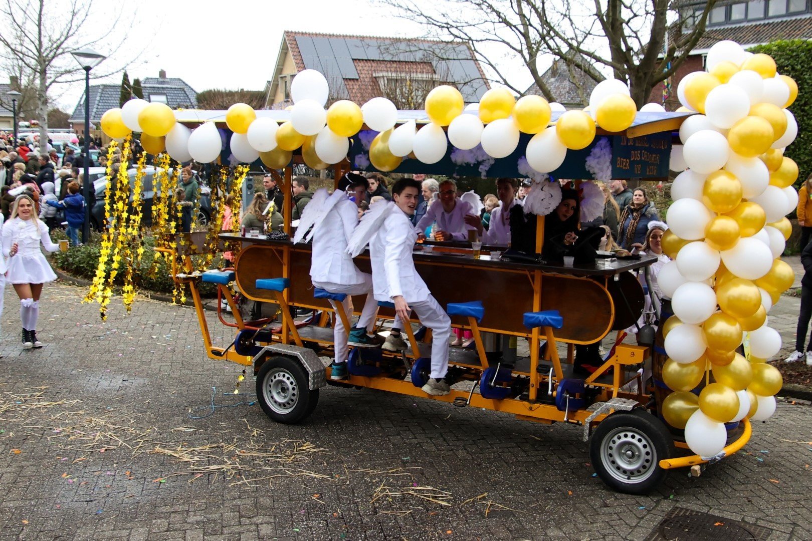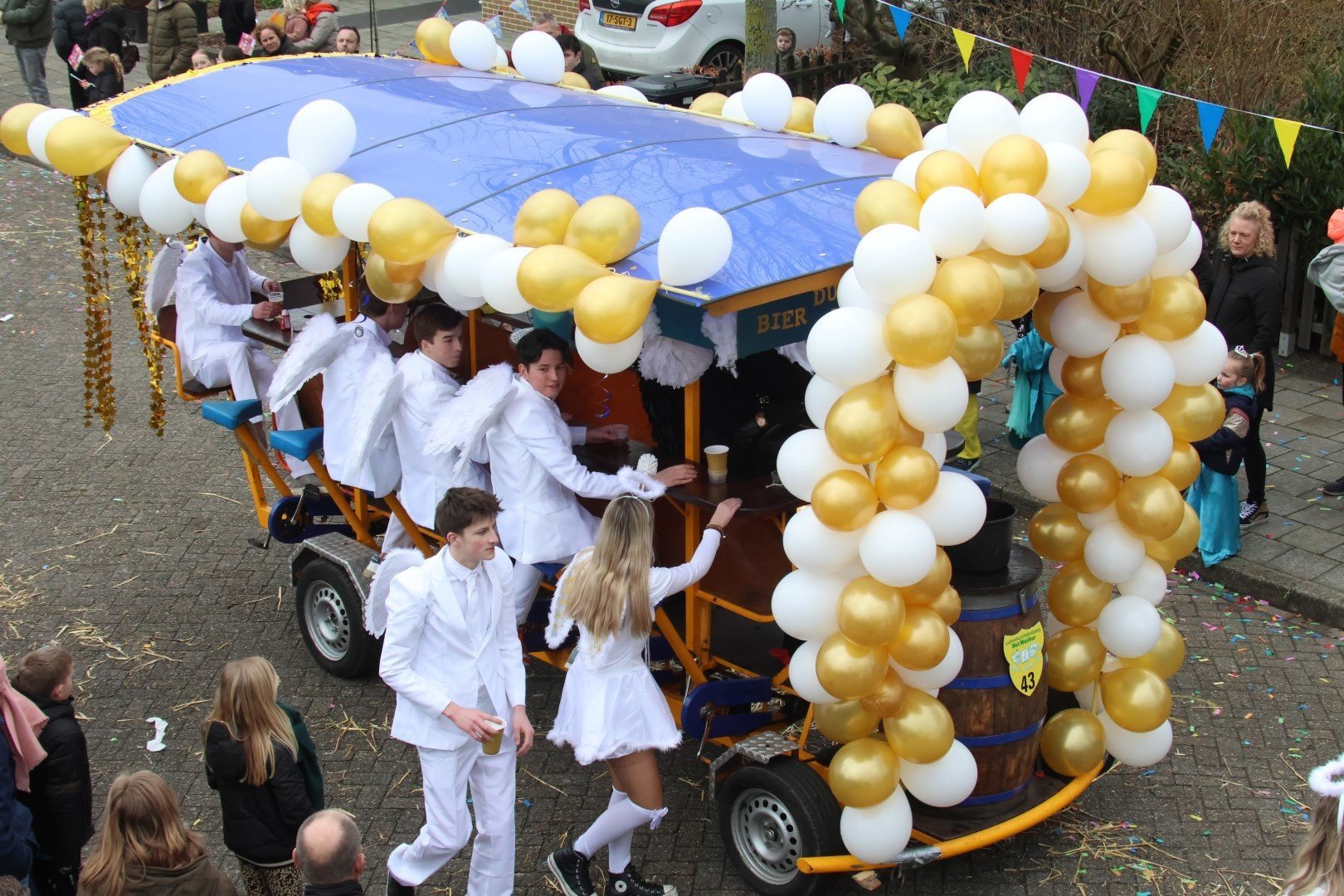 Als stralende witte engeltjes, of moeten we zeggen bengeltjes, zaten ze gevleugeld en al op de versierde bierfiets.