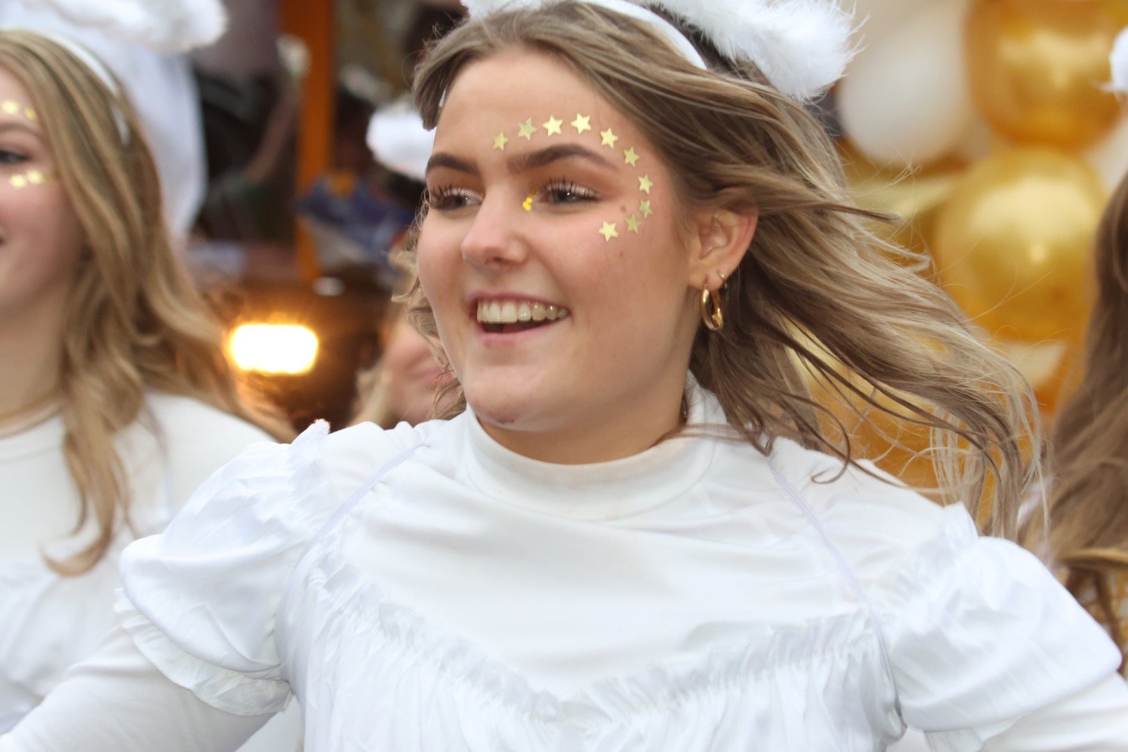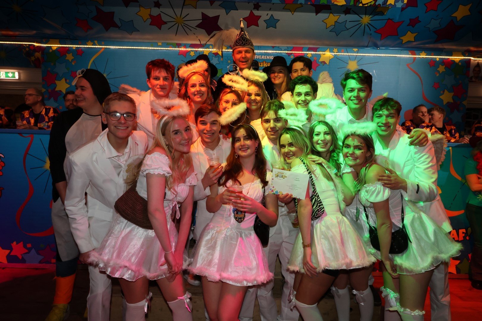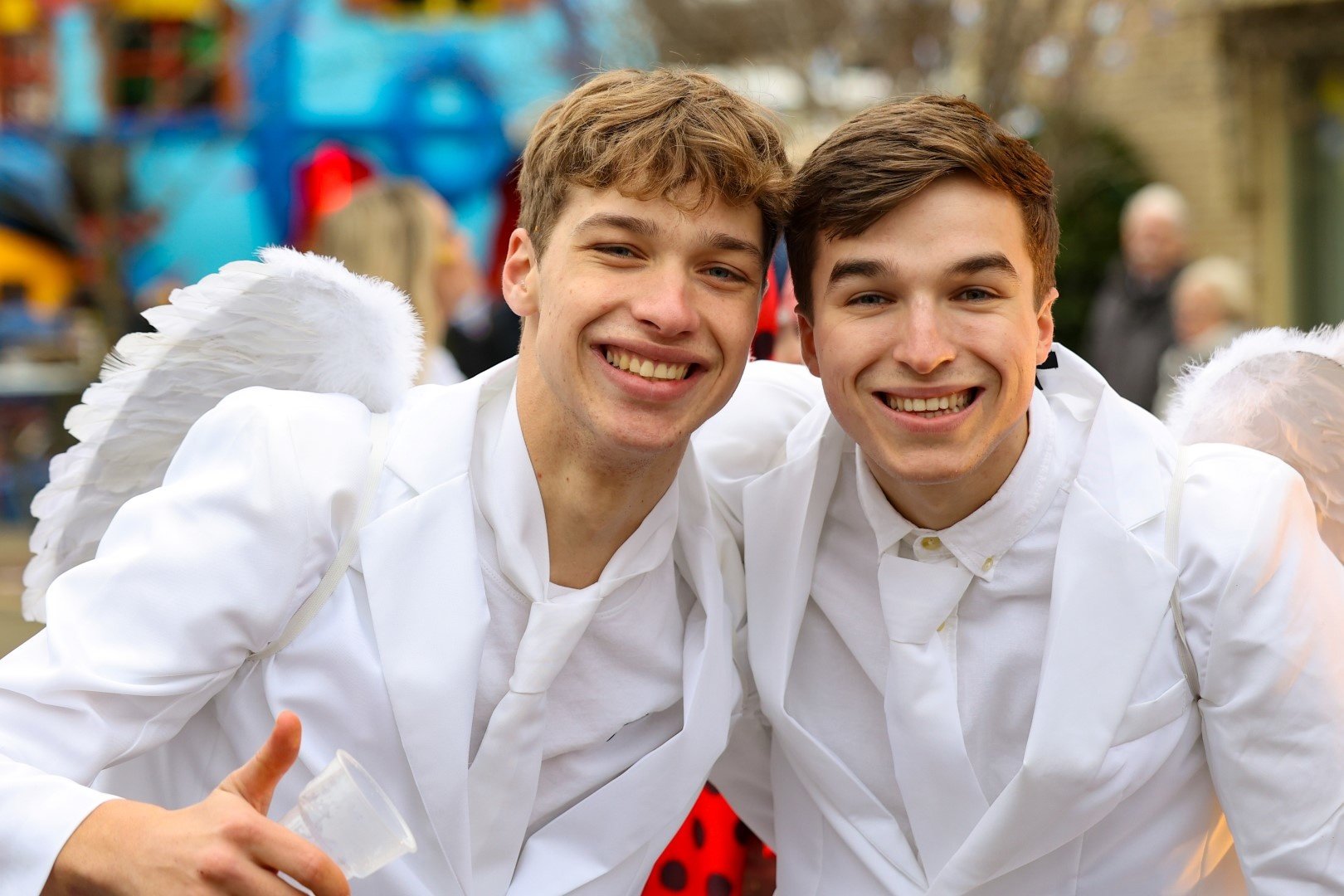 Als stralende witte engeltjes, of moeten we zeggen bengeltjes, zaten ze gevleugeld en al op de versierde bierfiets.