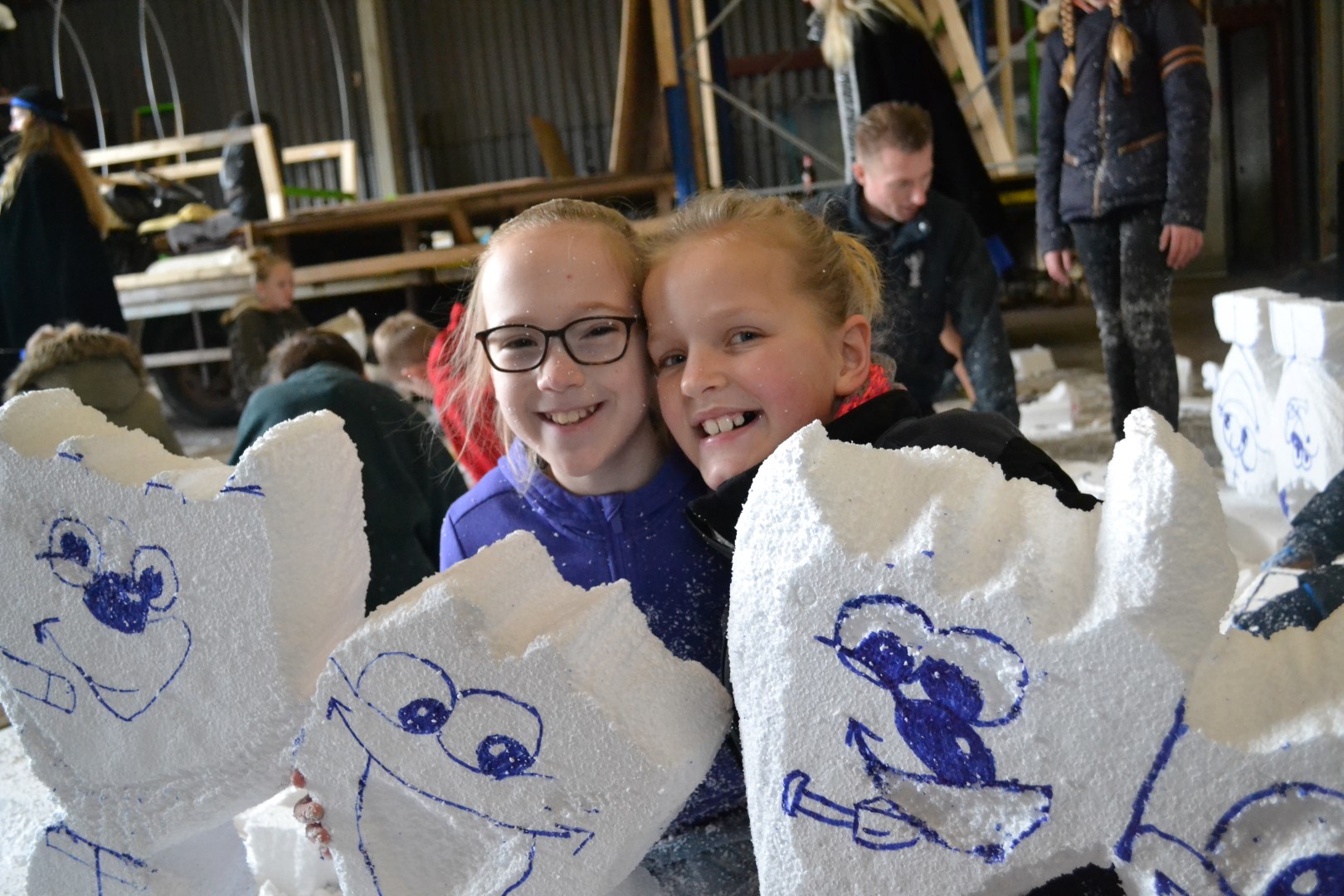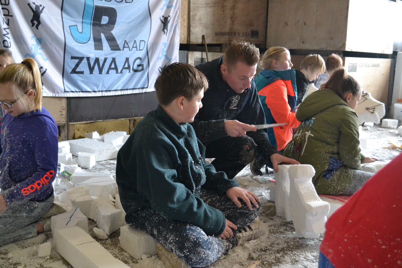 De schuur van Gerrit Bakker zat weer vol met nieuwsgierige kinderen die de fijne kneepjes van het piepschuimen wilde leren van de echte meesters in het piepschuimen; Sjoerd en Mathijs