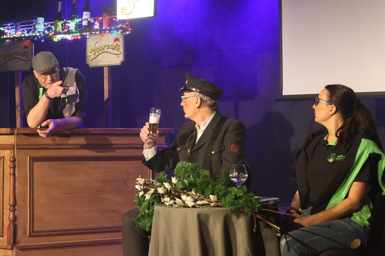 Na de pauze was het Voorcafé weer geopend. Barman Jos , Postbode Gerrit en, inmiddels zonder werk, Plien , namen het wel en wee van het dorp door. Het nieuws van Bakker Besseling was natuurlijk hot…maar ook de nodige roddels over de Prins en zijn gezin werden gedeeld. De vriendinnen van Prinses Renate kwamen met een leuke verrassing, zij hadden een muziek clip opgenomen met de passende boodschap: 'ik hou van jullie allemaal'. Ook voor Sjaak Takken was een leuke film gemaakt. Deze bezige bij is natuurlijk bekend als postbode , tuinman en uiteraard vaste medewerker van de Huttenbouw. Om alle bedrijven met een jubileumjaar in Zwaag te eren was een samenvatting gemaakt met het liedje ; in 1 minuut.
