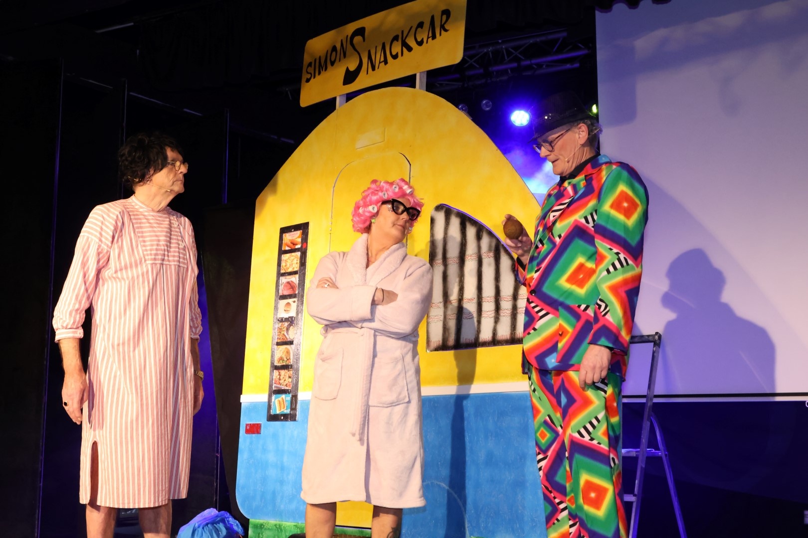 Na de pauze volgde een verrassing voor Fleur Gitzels. Fleur werd gedecoreerd met een onderscheiding van de EPC, het rode bolhoedje. Zij werd bedankt omdat zij al vele jaren de kaartjes en bloemen verzorgd bij Lief en Leed in het dorp. Een kleine hint in de Lief en Leed app-groep...en Fleur bezorgd in de kortst mogelijk tijd een kaartje. Met een mooie bos bloemen en het felbegeerde Bolhoedje werd Fleur met een warm applaus bedankt voor deze mooie inzet. Snel werd geschakeld richting toneel voor deel 2 van de avond. Zo startte postbode Gerrit geheel in stijl in een brandweerwagen en streek met Pauline neer in het vertrouwde het Voorcafé. Uiteraard met barman Jos achter de toog. ZVV Zwaag, de Steek van Co en Jaap en Simona 60 jaar getrouwd waren een paar van de vele anekdotes die in het café de revue passeerden. Afgewisseld met een paar video hoogstandjes als de clip over de Wagenbouwers en een Kopje koffie glazenwasser? , maakte de voorstelling compleet.