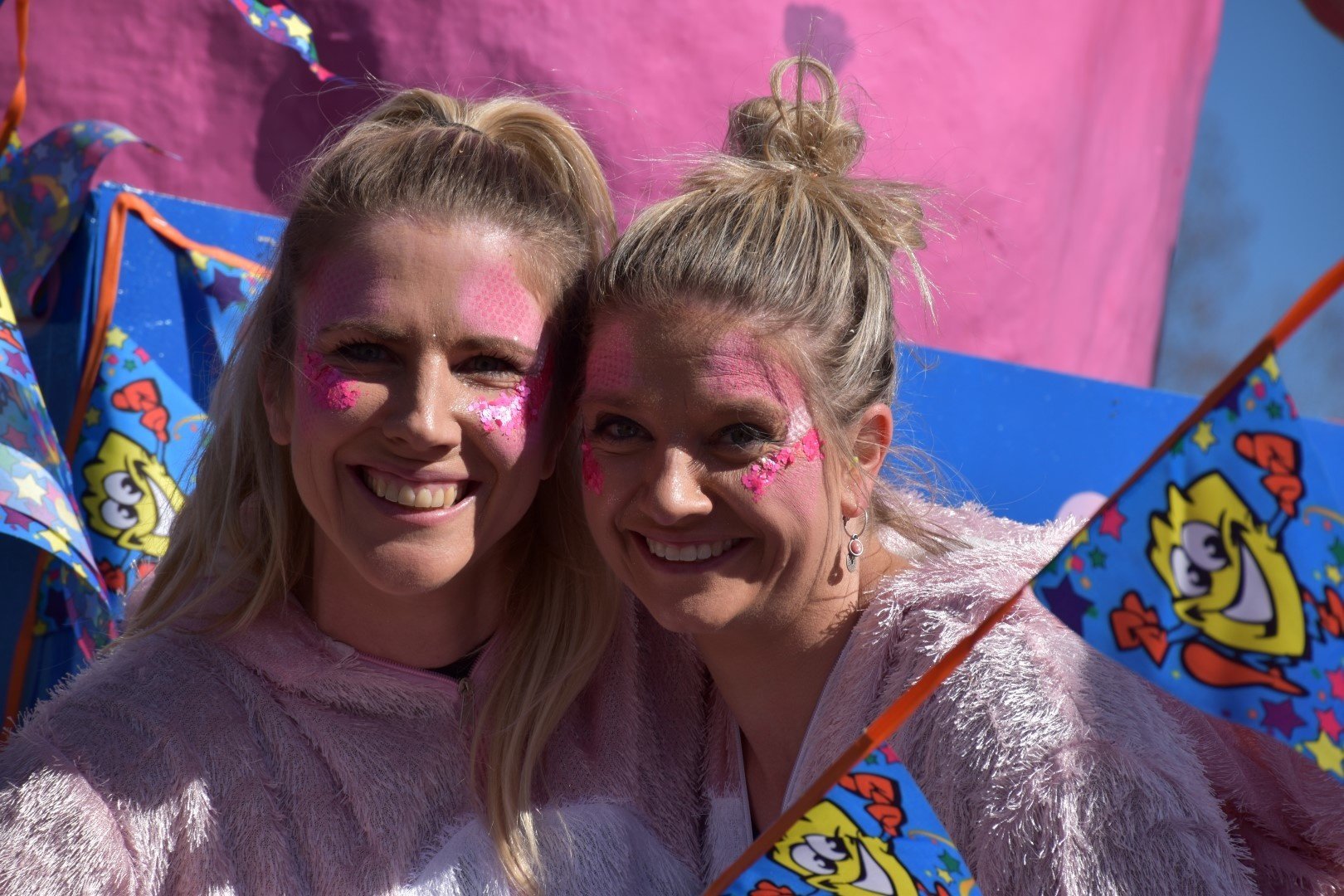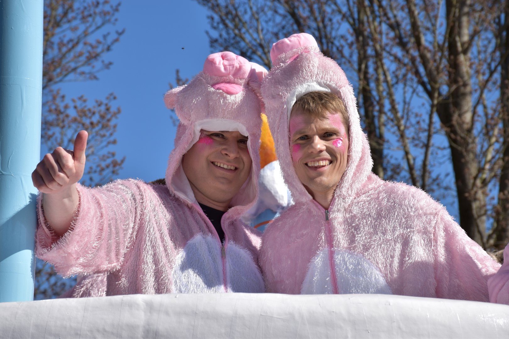 Als echte feestvarkens stonden ze te dansen en te sjansen op de kleurrijke wagen.