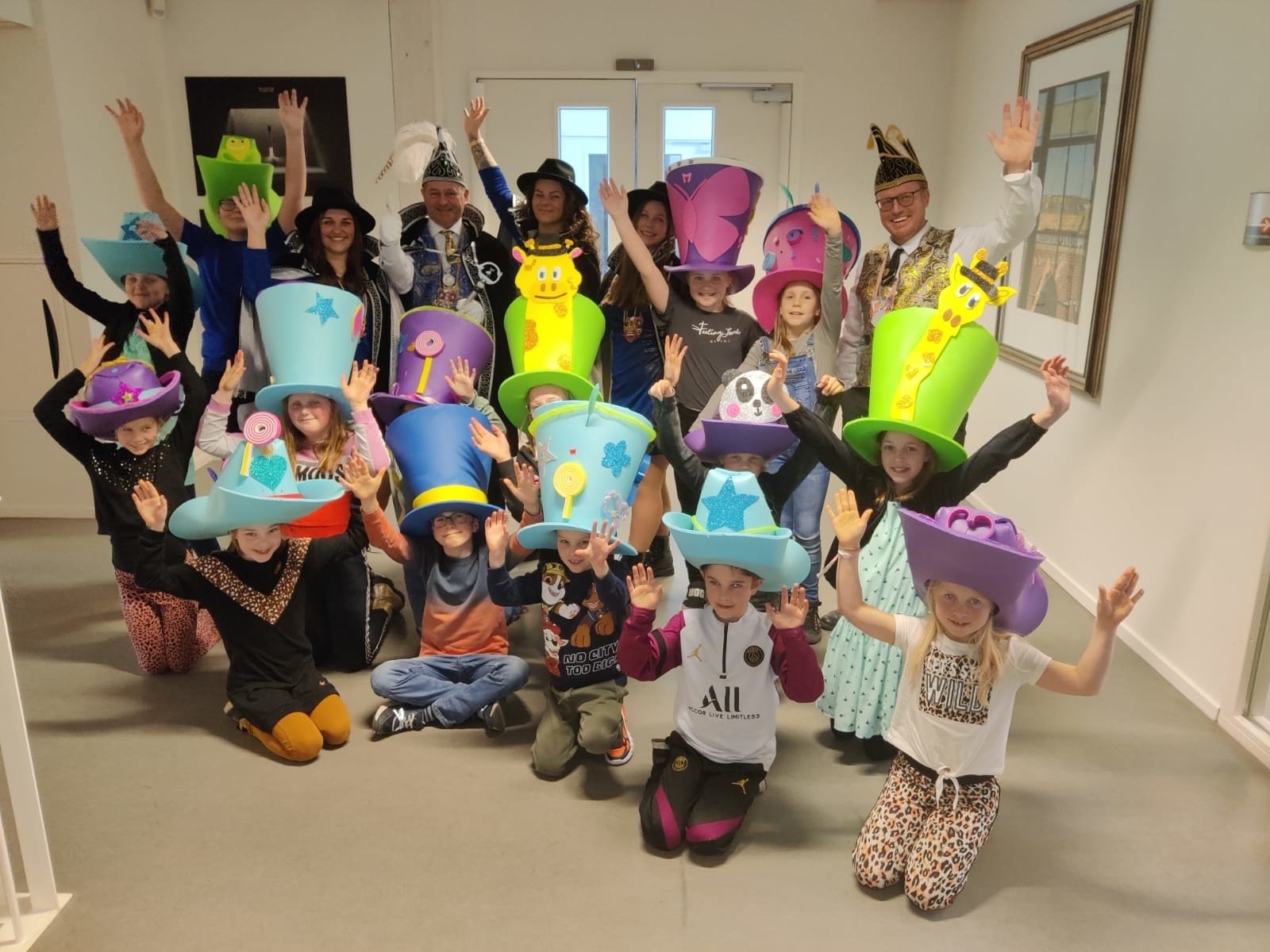 Alle foam onderdelen van de enorme hoeden werden met een hitteblazer aan elkaar geplakt en op maat gemaakt voor iedereen.
