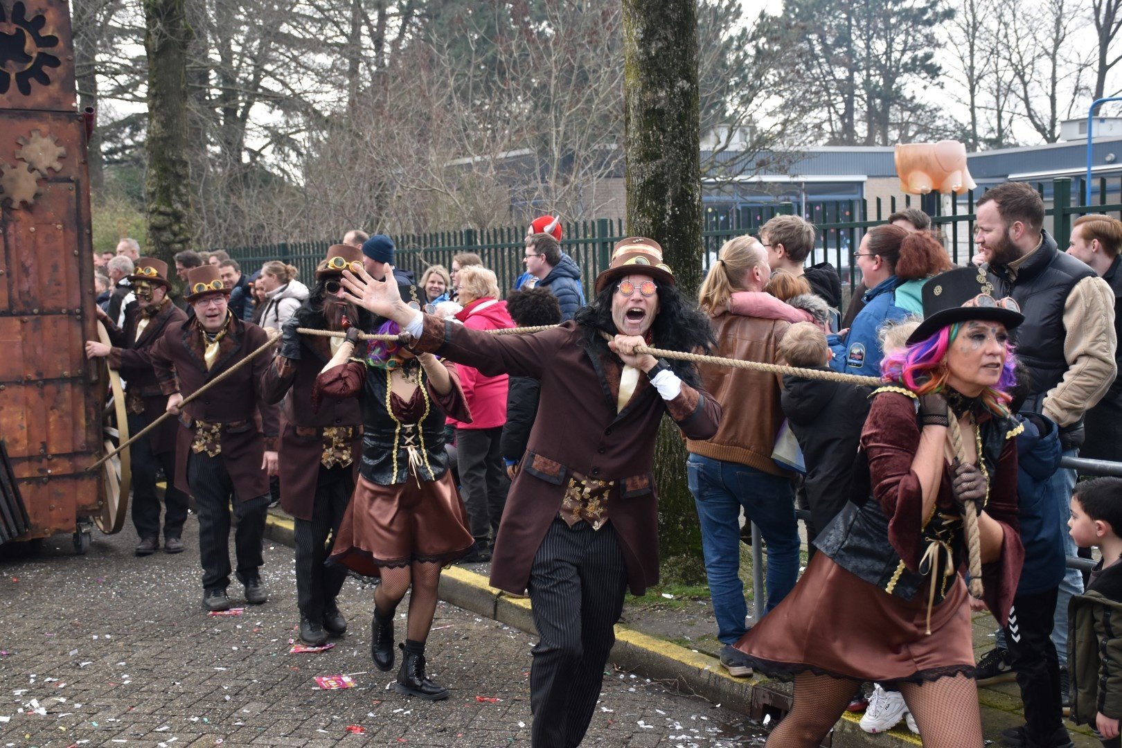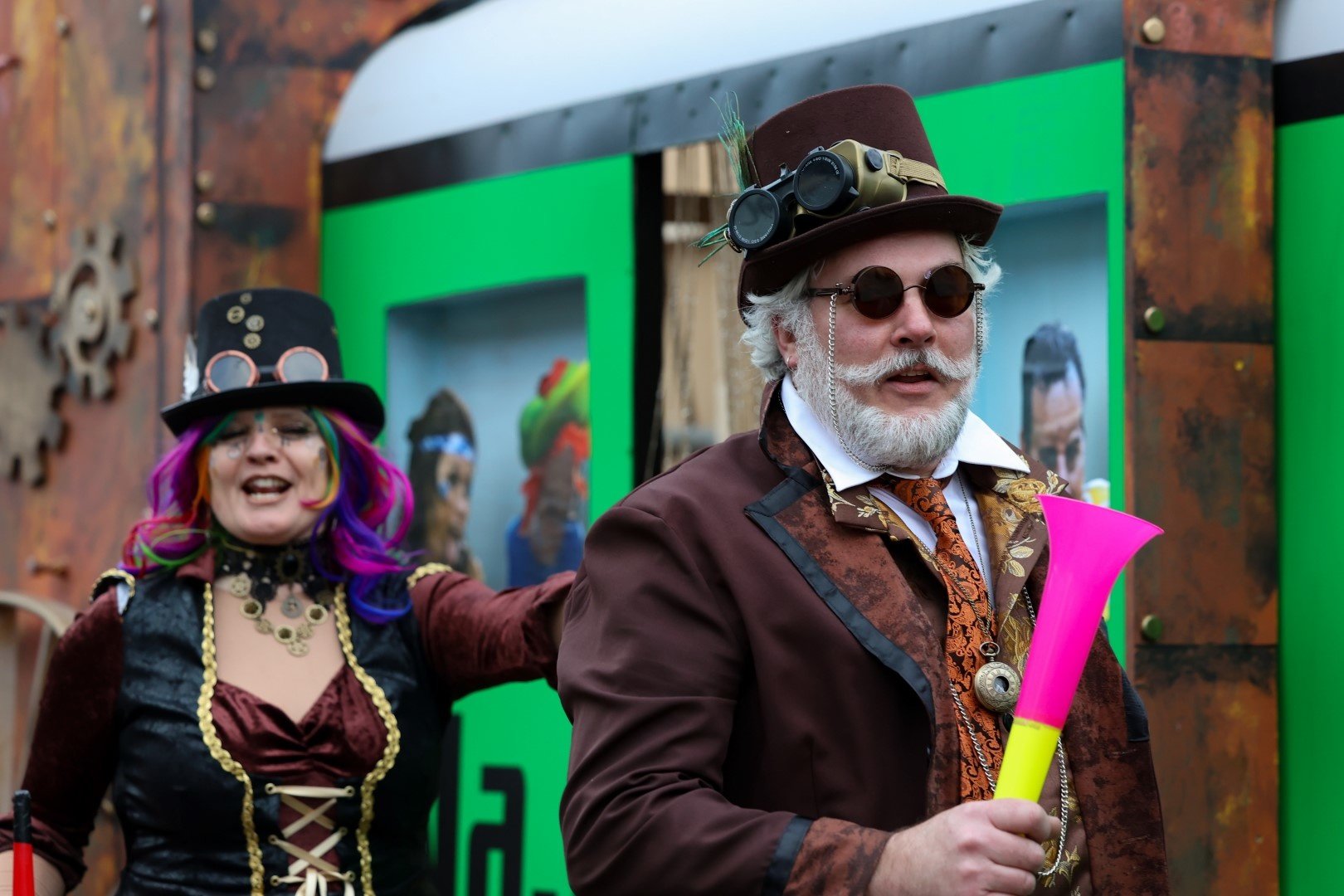 Dit jaar hadden ze fantasie en fictie gevangen in een steampunk trein die geheel in stijl met touwen werd voortgetrokken. Maar na het uitschuiven naar het 12 meter lange geheel kwam daar de carnavaleske uitspatting.