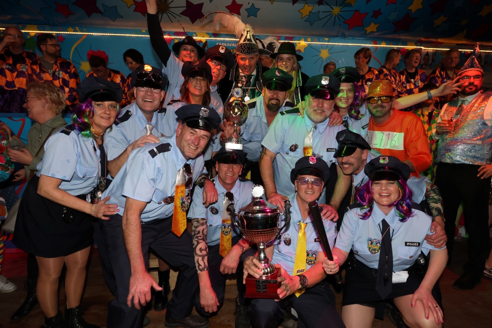 Elk jaar verschijnt NaJaa weer met iets ludieks aan de start van de optocht. Hoe verzinnen ze het toch steeds om op de gezichten van het publiek een grote lach te toveren. Zou dat kunnen liggen aan hun ruim 30 jaar ervaring ? Dit jaar traden ze als Politie Zwaag hard op tijdens de optocht. Verkleed als Oom Agent hield NaJaa het publiek in het gareel waarna ze hard optraden. Letterlijk dan want de scheurende gitaren kwamen te voorschijn en hardrock muziek klonk uit de speakers van het politieautootje. Het publiek vond het fantastisch en beloonde hen met de derde prijs voor de Goinprijs. De jury was nog enthousiaster en van hen kregen ze de eerste prijs bij de Loopgroepen.