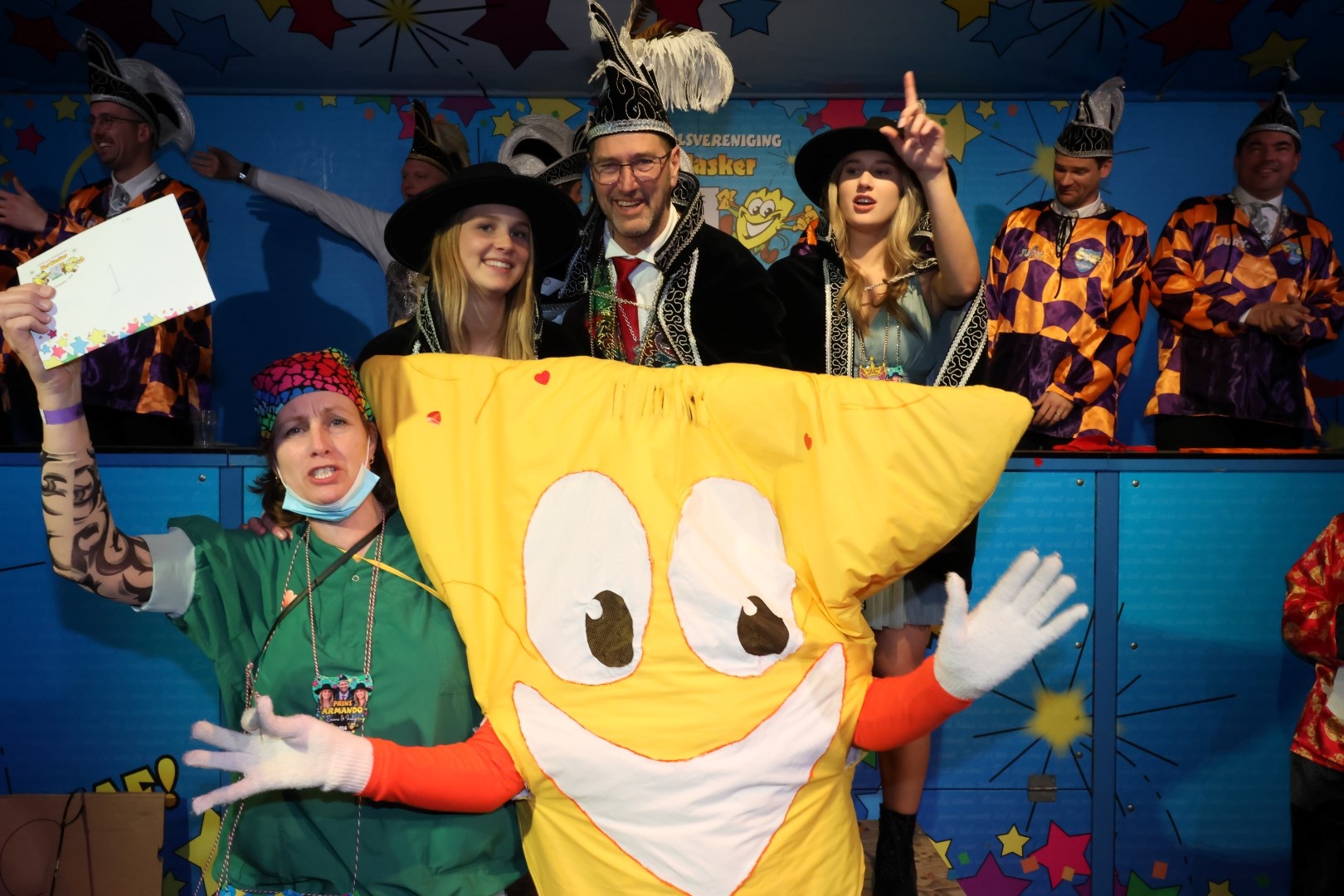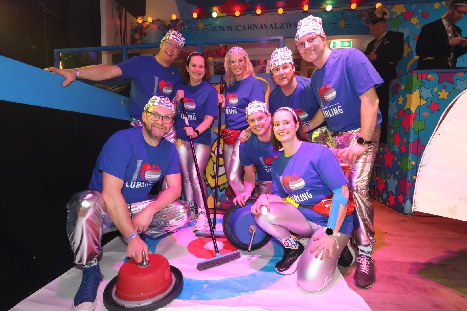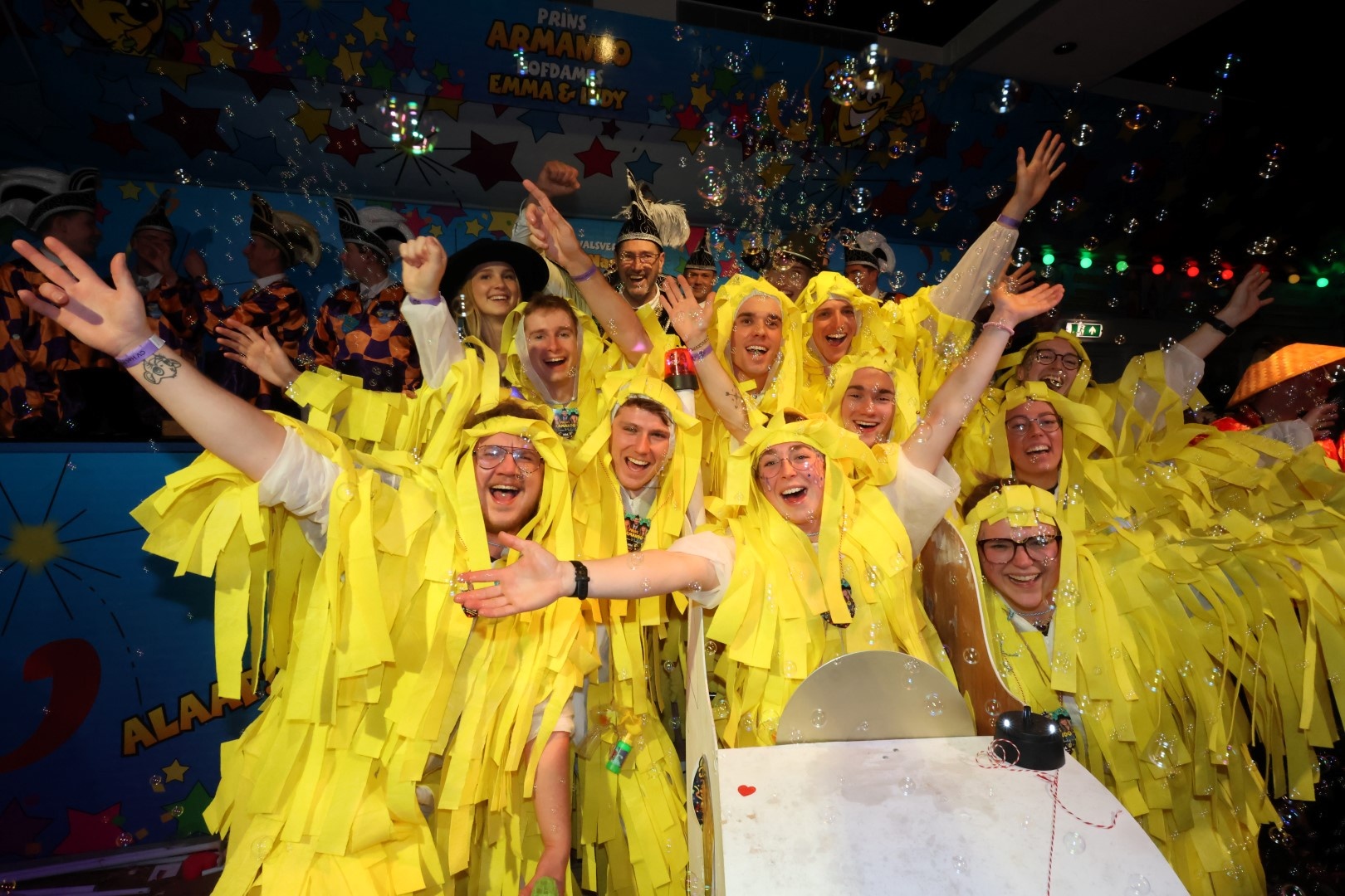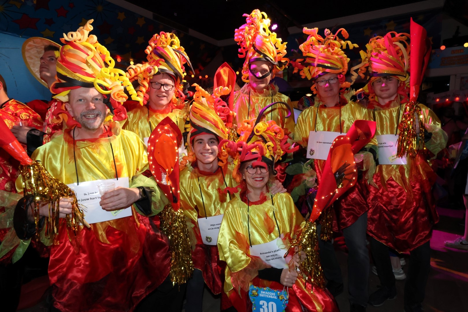 Wat een gekke zottigheid tijdens het Swaeghs Zottenbal. Een zaal vol leut met allerlei items die voorbij kwamen. Wat dacht je van al die chinees, De botsauto's van 0,5 promile en G1idee en het Curlingteam van de Pilspiraten. Ook Prins Armando was uiteraard een gewillig onderwerp: 'niet lappen maar tappen', 'ladderzatten', 'kopje koffie glazenwasser', '(b)armando' en noem het maar op. Erg leuk was ook 'HG doet wat het belooft, schimmel weg' van de Nag ientje toe en 'de toeristenplaag' van de Hatseflatsers maar ook het offerfeest de Bende van Ellende.
