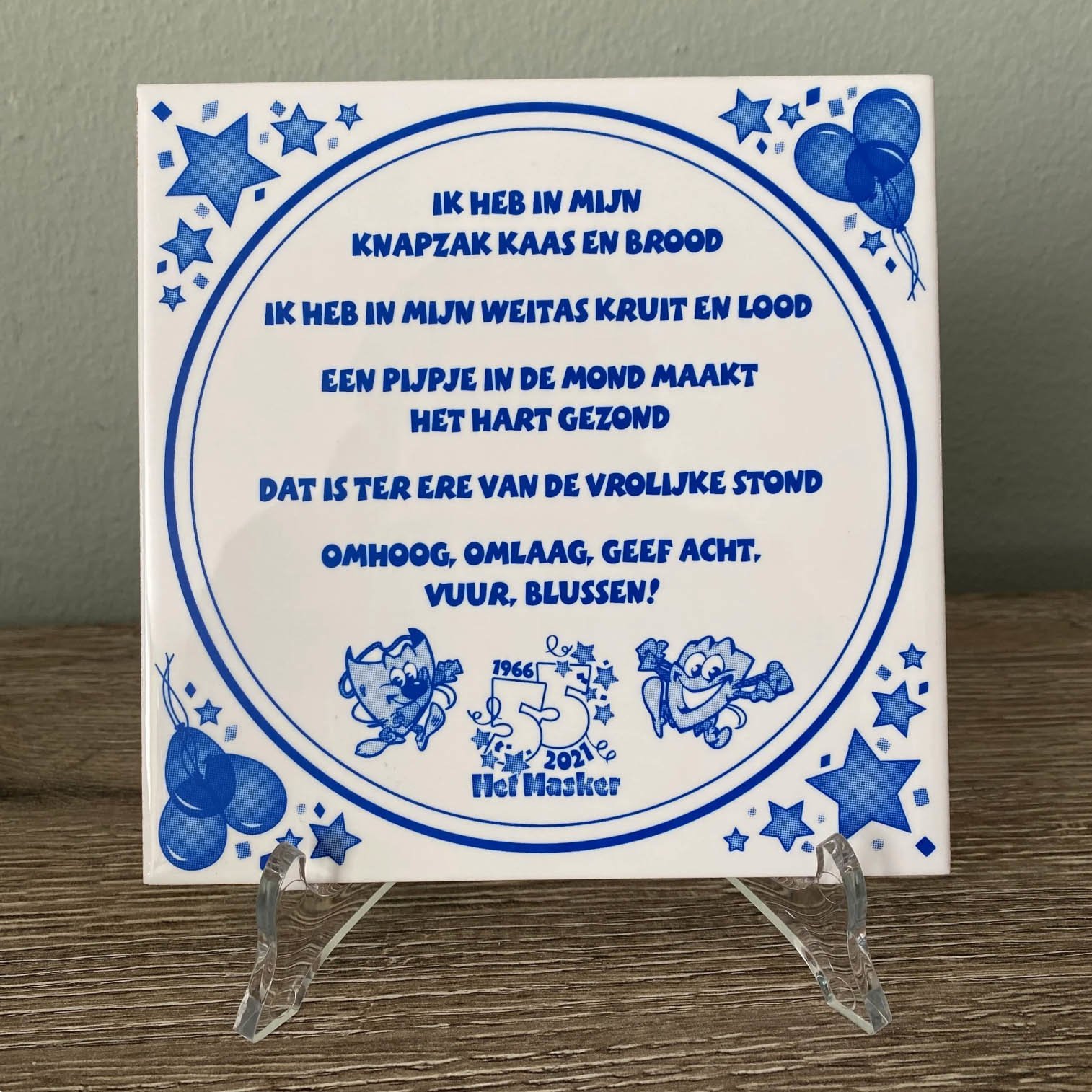 Wie kent het Zwaags volkslied niet? Het wordt vaak bij de eerste borrel van de avond luidkeels gezongen. Het Masker heeft speciaal voor het jubileum jaar een tegeltje laten maken met de tekst van het Zwaags volkslied. De meeste sponsoren van Het Masker hebben hem inmiddels al binnen maar nu is hij ook voor iedereen in huis te halen via de webshop www.carnavalzwaagshop.nl van Het Masker.
