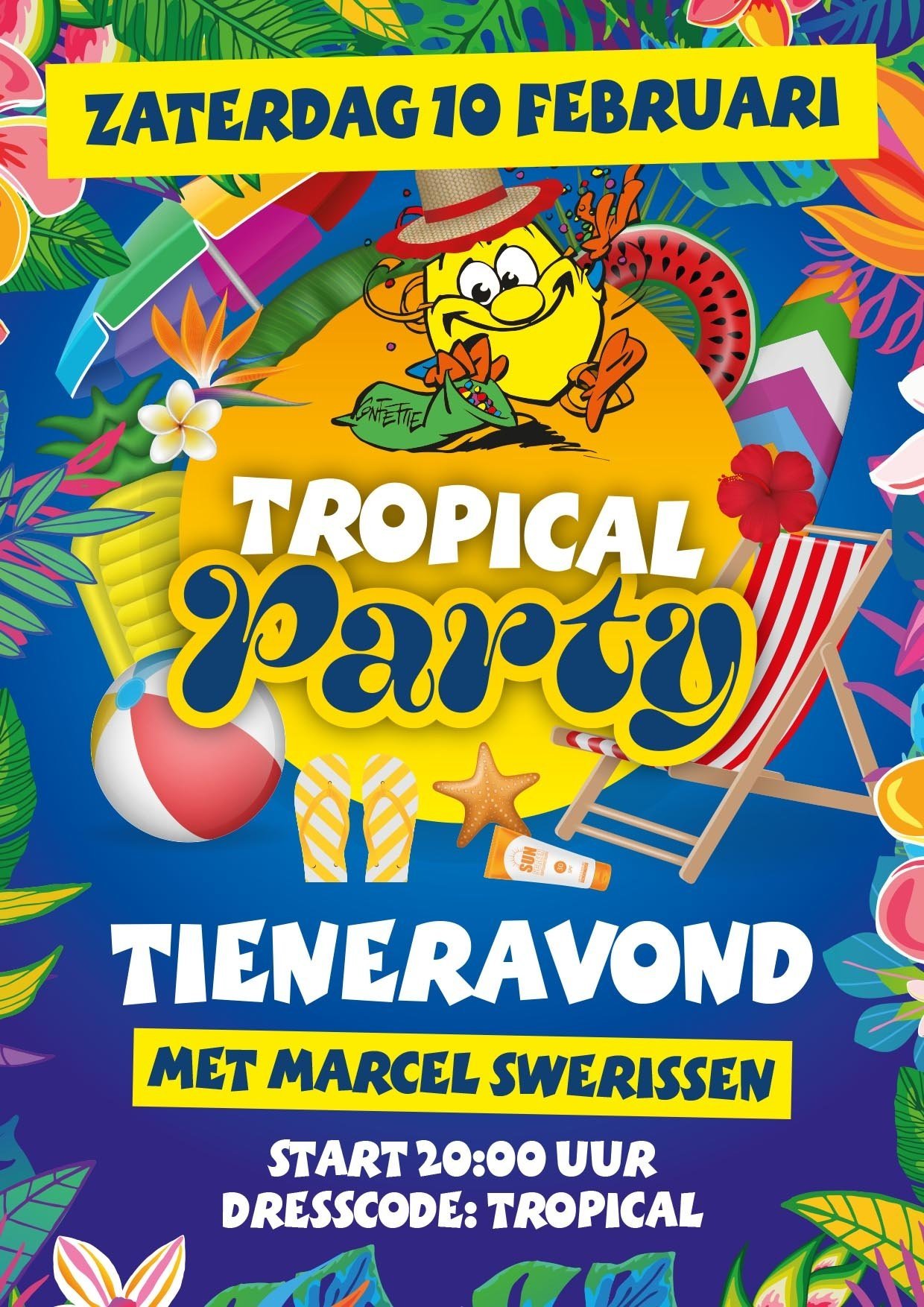 We duiken dit jaar in de tropische sferen en zoeken de warmte op. De Leuttempel zal ook tijdens de tieneravond een dampende en stampende feestzaal worden vol tropische verrassingen. Je wordt ondergedompeld in het feestgedruis en Prins Drikus zal samen met Hofdames Jamy & Nadia en de Raad van Elf de voetjes van de vloer dansen.