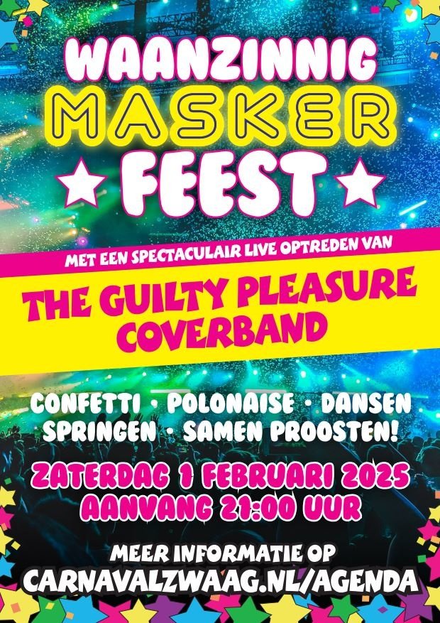 Het Waanzinnig Masker Feest op zaterdag 1 februari wordt een spectaculaire avond met live muziek van The Guilty Pleasure Coverband (powered by Partycentrum De Witte Valk).